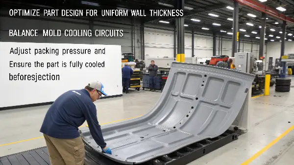 To fix warpage, you must address the root cause: non-uniform shrinkage. This is best achieved by optimizing part design, mold cooling, and processing parameters. Ensure uniform wall thickness in your part design. In the mold, balance the cooling circuit to prevent one area from cooling faster than another. Finally, adjust packing pressure and time on the machine to compensate for shrinkage, and check that the part is fully cooled before ejection.
